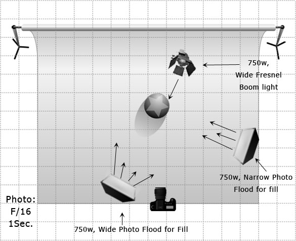 Quote: “The next light is a narrow focus photo flood light to the left of the camera at about 90 degrees from the subject”
